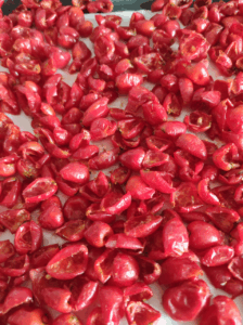 Wenn Du die Hagebutten selbst pflücken und verwenden möchtest, sollten sie ordentlich rot gefärbt und nicht mehr steinhart, aber noch fest sein. Hagebutten enthalten viele Kerne, die wiederum mit kleinen Härchen versehen sind. Das macht eine weitere Verarbeitung zugegebenermaßen aufwendig. Aber aufgrund ihres hohen gesundheitlichen Wertes lohnt dieser Aufwand. Du kannst die Früchte, wenn sie von Blütenansatz und Stiel befreit sind, einfach trocknen. Das geht entweder im Ofen bei niedriger Temperatur (ca. 50-60°C) oder in einem Dürrgerät oder man trocknet sie im Ofen an und lässt sie dann dünn ausgelegt bei Zimmertemperatur fertig trocknen. Getrocknete Hagebutten (mit Kernen) können für Tee oder für Hagebuttenpulver verwendet werden.